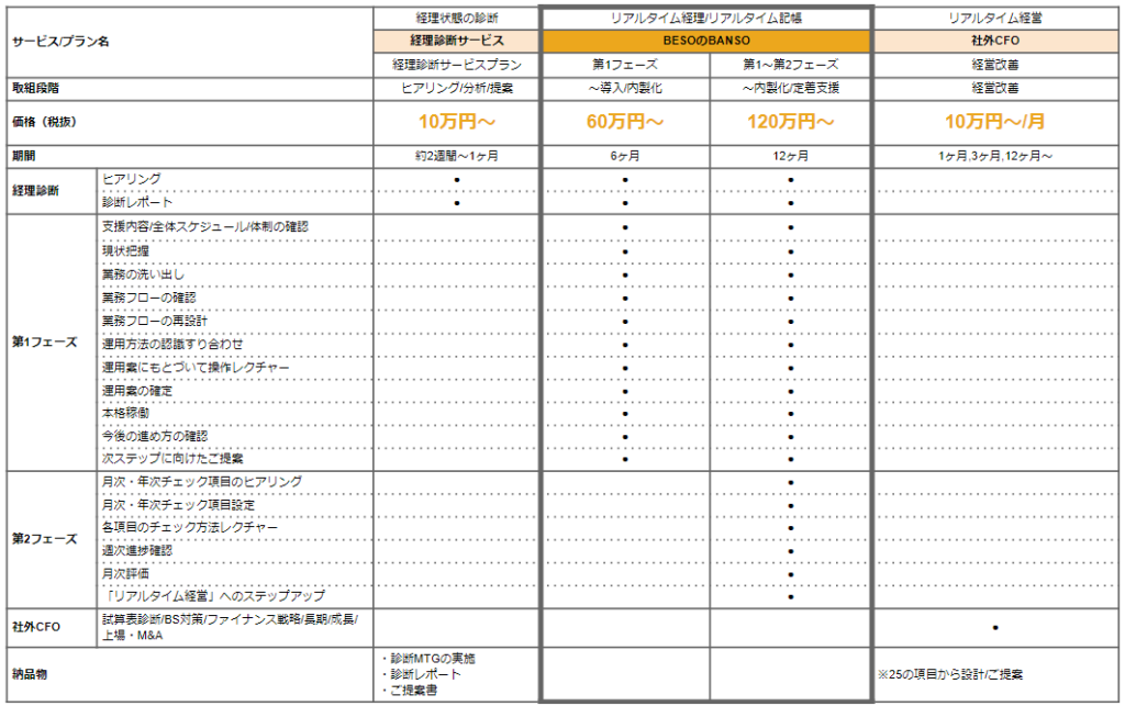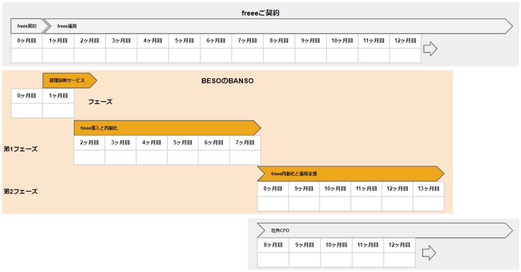 BESOでは、300社以上のfreeeの導入と内製化の経験により、事業フェーズや経理部門の状況によって異なる課題感にも対応できるプランをご用意しています。