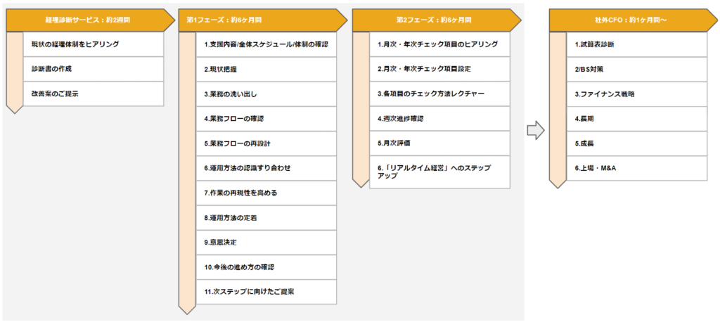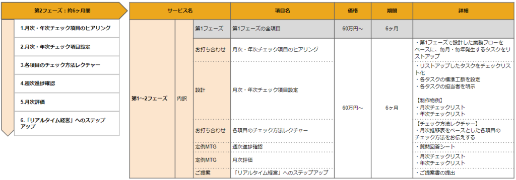 期間としては、経理診断にて約1ヶ月、第1フェーズ、第2フェーズでそれぞれ約6ヶ月の期間設計。企業にカスタマイズしたfreeeの内製化を実現します。
